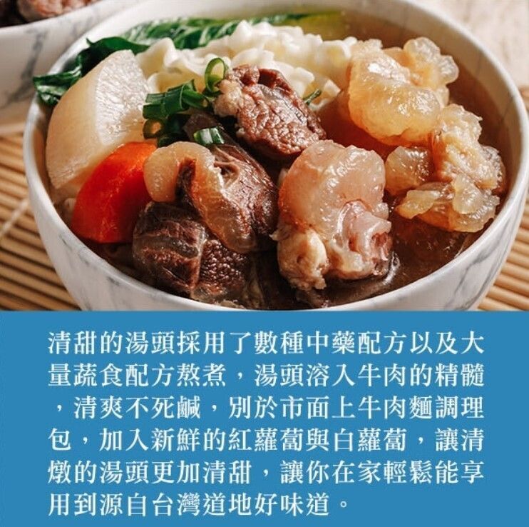 嚴選澳洲牛腱心,是牛腱中筋肉比例最好的部位,這個部位筋多肉質硬實,含有豐富的膠原蛋白,佈滿細筋,獨特高溫高壓殺菌技術燉煮,讓整個肉汁排空後再重新吸回肉汁,每一塊牛腱肉皆軟嫩入味,清甜的湯頭採用了數種中藥配方以及大量蔬食配方熬煮,湯頭溶入牛肉的精髓,清爽不死鹹,別於市面上牛肉麵調理包,加入新鮮的紅蘿蔔與白蘿蔔,讓清燉的湯頭更加清甜,讓你在家輕鬆能享用用到源自台灣道地好味道。