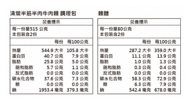 水、牛腱肉(澳洲)、牛筋(澳洲)、紅蘿蔔、白蘿蔔、牛骨(澳洲)、洋蔥、芹菜、牛番茄、玉米、蔥、薑片、米酒【米、精緻食用酒精】、食鹽、糖、白荳蔻、花椒、大茴香、白胡椒粒、甘草、陳皮