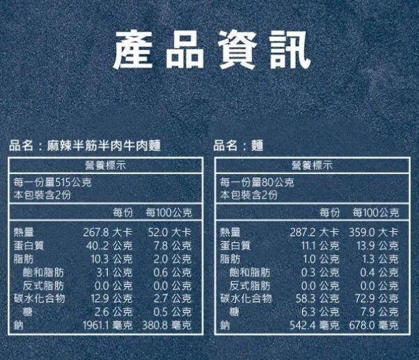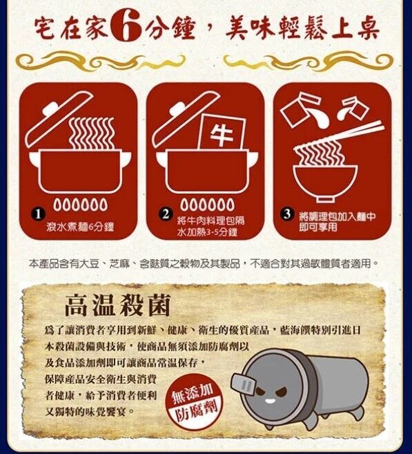 牛肉湯包成份:水、牛腱肉、牛筋、紅蘿蔔、白蘿蔔、牛骨、麻辣醬【辣椒、大豆沙拉油、豆豉(黑豆、食鹽)、鹽、冰糖、素食湯粉(鹽、葡萄糖、L-麩酸鈉、糖、5'-次黃嘌呤核甘磷酸二鈉、5'-鳥嘌呤核甘磷酸二鈉、胺基乙醯、DL-胺基丙酸、二氧化矽、檸檬酸)、花椒、八角、桂皮】、醬油【水、非基因改黃豆(高蛋白豆片)、小麥、蔗糖轉化液糖、食鹽、酒精、酵母抽出物】、辣豆瓣醬【水、砂糖、非基因改造黃豆、辣椒、鹽、純釀造醋】、黑豆瓣醬【非基因改造黑豆、水、蠶豆、鹽、甘蔗液糖、麵粉、芝麻油、大豆油、調味劑(5'-次黃嘌呤核甘磷酸二鈉、5'-鳥嘌呤核甘磷酸二鈉、L-麩酸鈉)、甜味劑(甘草酸鈉)、玉米糖膠、八角、乳酸】、米豆醬【基因改造黃豆、糙米、鹽、糖、水、食品級酒精、調味劑(5'-次黃嘌呤核甘磷酸二鈉、5'-鳥嘌呤核甘磷酸二鈉、L-麩酸鈉)、品質改良劑(偏磷酸鈉、無水焦磷酸鈉)、甜味劑(醋磺內酯鉀)】、洋蔥、牛番茄、番茄糊【番茄、檸檬酸】、鹽、砂糖、蒜頭、薑片、L-麩酸鈉、白荳蔻、八角、肉桂、甘草、陳皮、當歸、草果、砂仁。