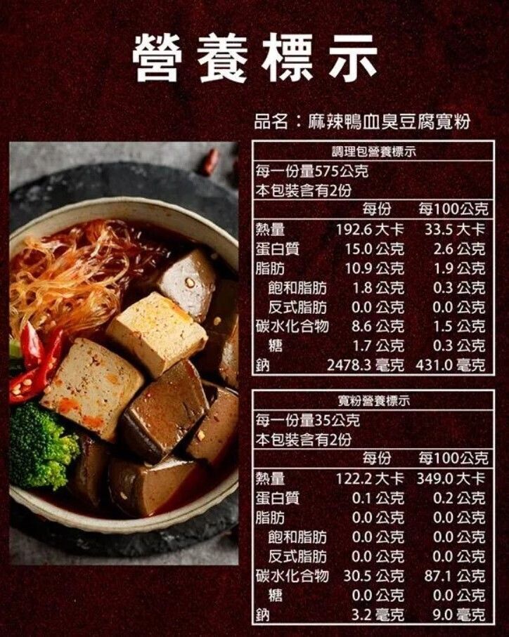 調理包&油包成份:水、雞骨、鴨血【鴨血、水、鹽、焦磷酸鈉、多磷酸鈉、偏磷酸鉀、矽樹脂、脂肪酸山梨醇酐酯、聚山梨醇酐脂肪酸酯、羧甲基纖維素鈉】、臭豆腐【豆腐(水、黃豆、硫酸鈣)、發酵汁】、麻辣醬【沙拉油、芝麻香油(大豆油、芝麻)、辣豆瓣醬(蠶豆、精鹽、辣椒)、酒釀(米、酒麴、水)、紅蔥、蒜、糖、鹽、胡椒、甘草、肉桂、草果、八角、豆蔻、朝天椒、大紅袍、雞心椒】、鹽、L-麩酸鈉。