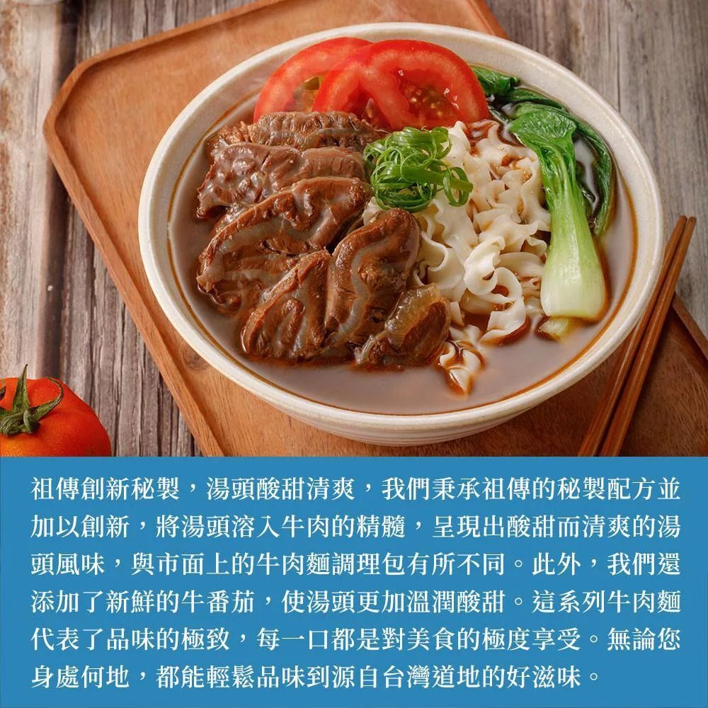 嚴選澳洲牛腱心,極致的肉質享受,這個部位是牛腱中筋肉比例最完美的,其筋多而肉質堅實。更重要的是,這個部位富含豐富的膠原蛋白,並佈滿細小的筋絲,讓您感受到肉質的極致享受。獨特的烹飪工藝,採用獨特的高溫高壓殺菌技術燉煮,這使得整個肉汁排空後再重新吸收,使牛腱肉保持了軟嫩入味的特點,同時讓牛筋保持了香Q彈牙的口感。祖傳創新秘製,湯頭酸甜清爽,我們秉承祖傳的秘製配方並加以創新,將湯頭溶入牛肉的精髓,呈現出酸甜而清爽的湯頭風味,與市面上的牛肉麵調理包有所不同。此外,我們還添加了新鮮的牛番茄,使湯頭更加溫潤酸甜。這系列牛肉麵代表了品味的極致,每一口都是對美食的極度享受。無論您身處何地,都能輕鬆品味到源自台灣道地的好滋味。
